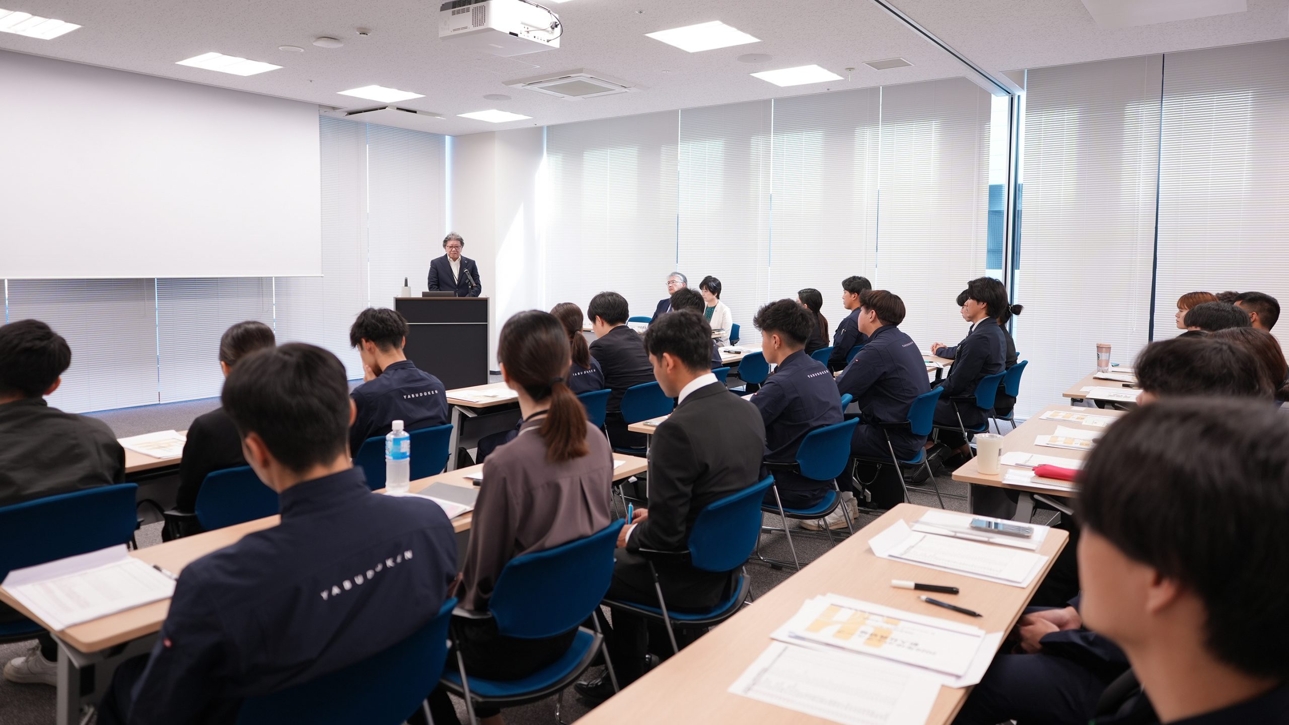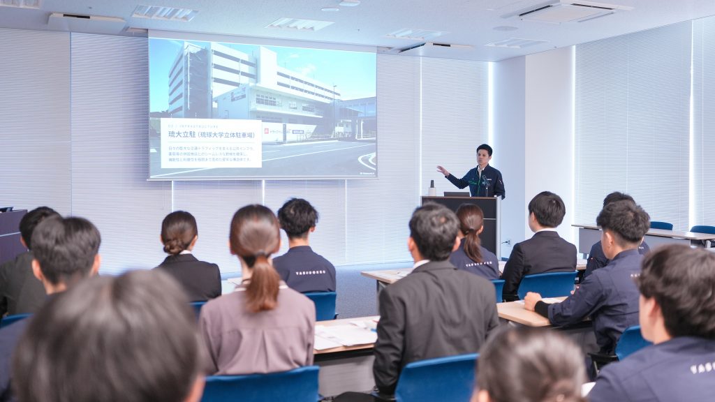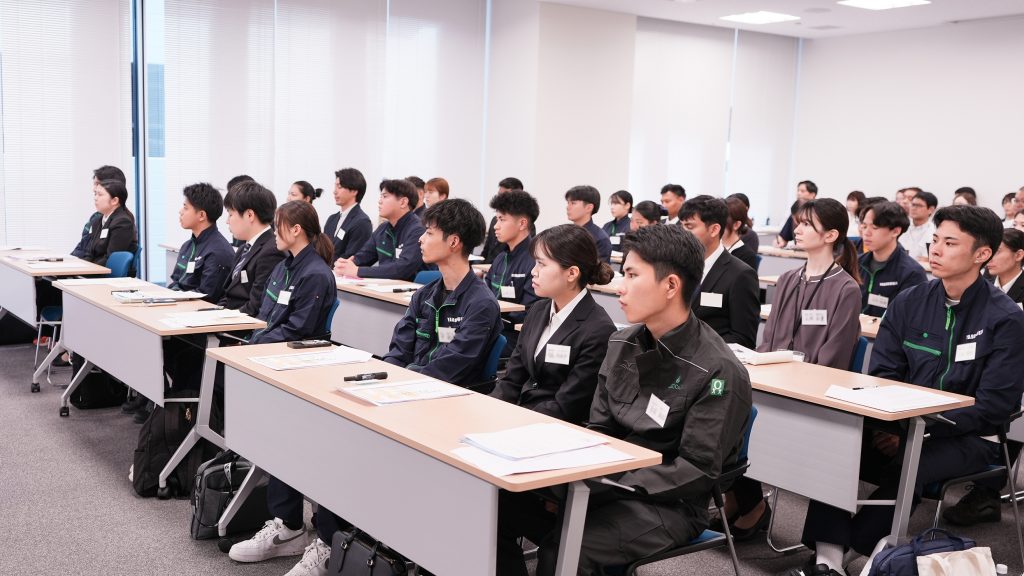 研修の前半では、津波会長・仲座専務・前田社長より新入社員へ向けて、激励のメッセージが送られました。グループが築いてきた歴史と、それを次世代へと繋ぐ「バトン」を受け取った新入社員たちの、身の引き締まるような真剣な表情が非常に印象的でした。また、先輩社員による講話では、実体験に基づいたアドバイスに熱心に耳を傾けていました。