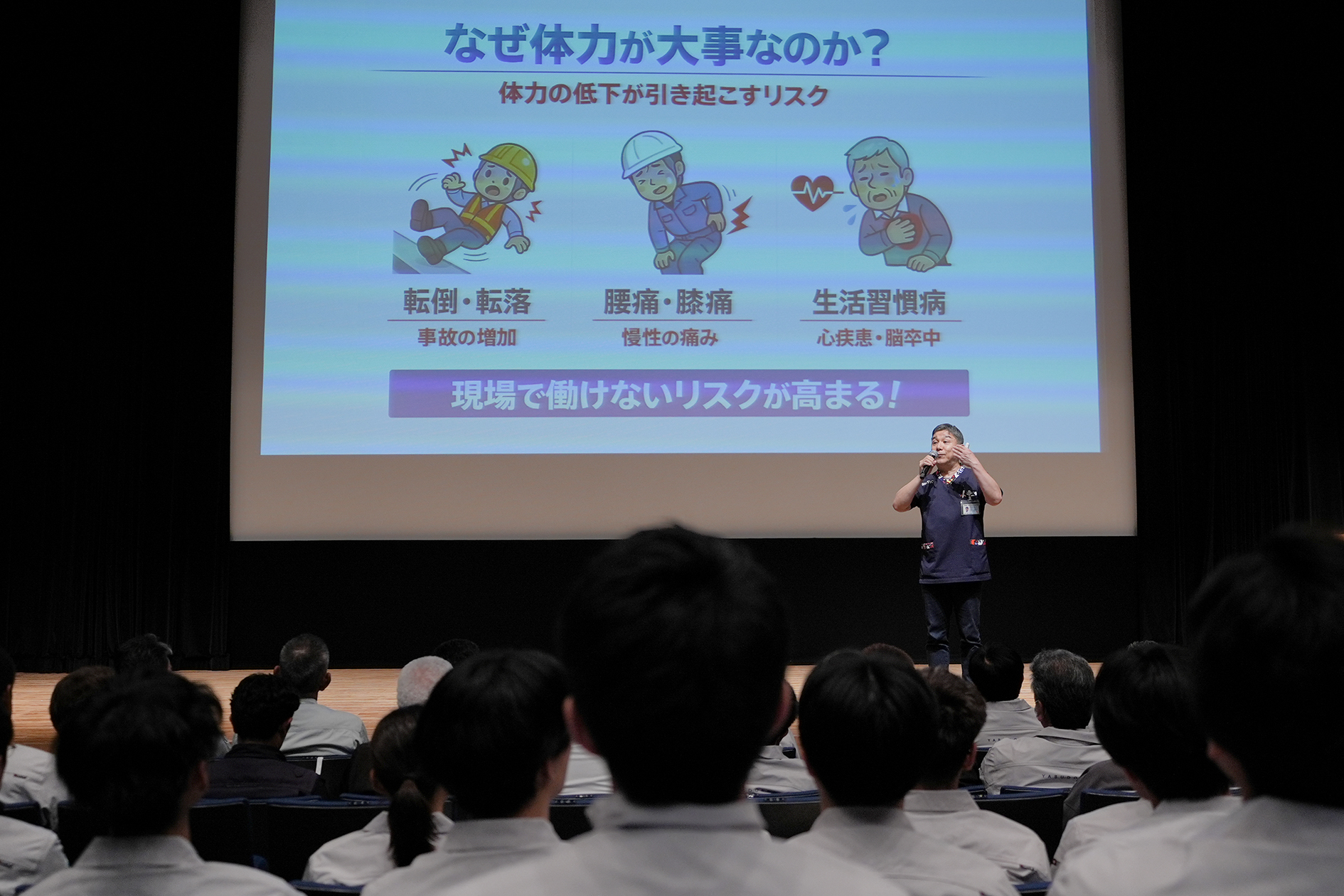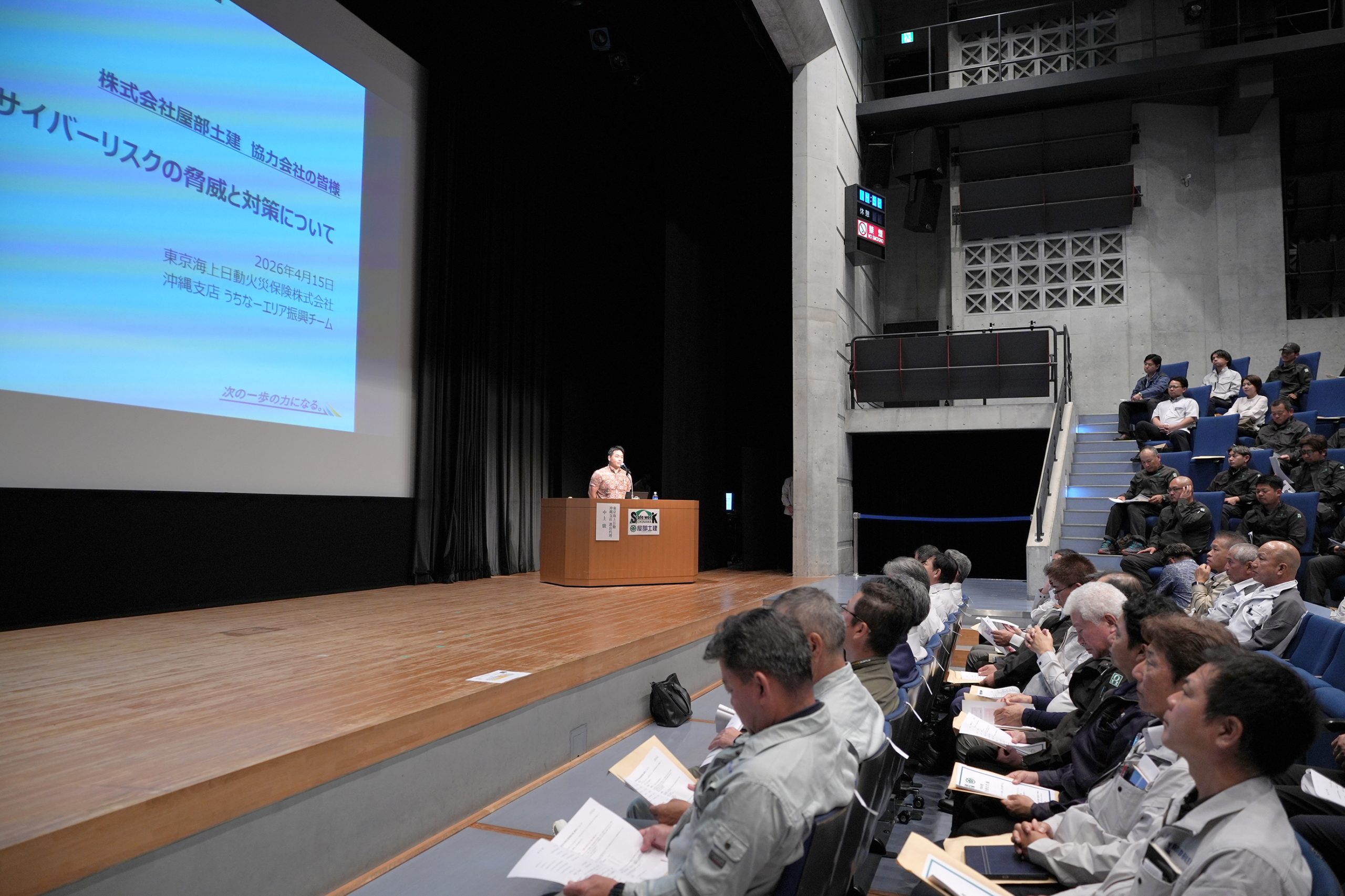 特別講演では、東京海上日動沖縄支店 中山駿 課長代理による「サイバーリスクの脅威と対策について」に加え、中部徳州会病院健康管理センター長 渡辺信幸 内科医による「動ける体こそ最高の安全対策〜10年後も現場で活躍できる健康管理」について拝聴し、心身両面からの安全確保の重要性を再認識しました 。