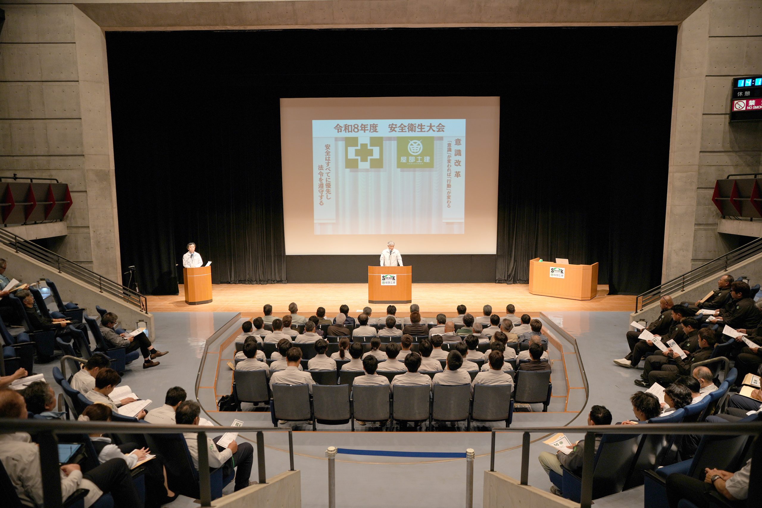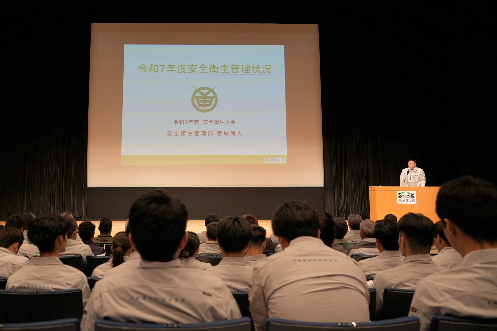 令和8年4月15日(水)、アイムユニバースてだこにて「令和8年度安全衛生大会」を開催しました 。大会では、昨年度の安全管理状況及び今年度の安全管理計画を共有し、続いて優良安全施工会社として株式会社丸内様、有限会社新崎重機様の表彰を行いました 。